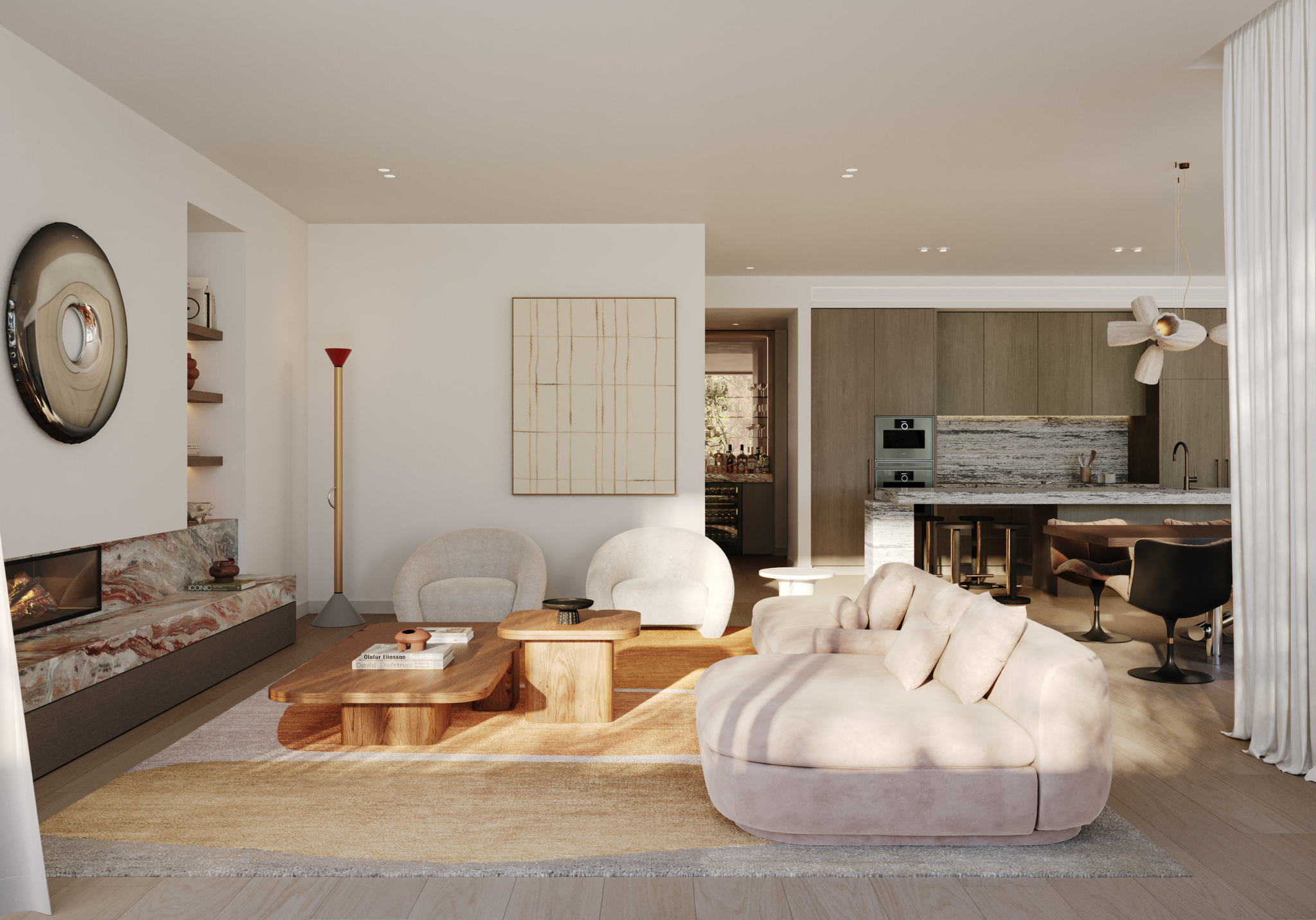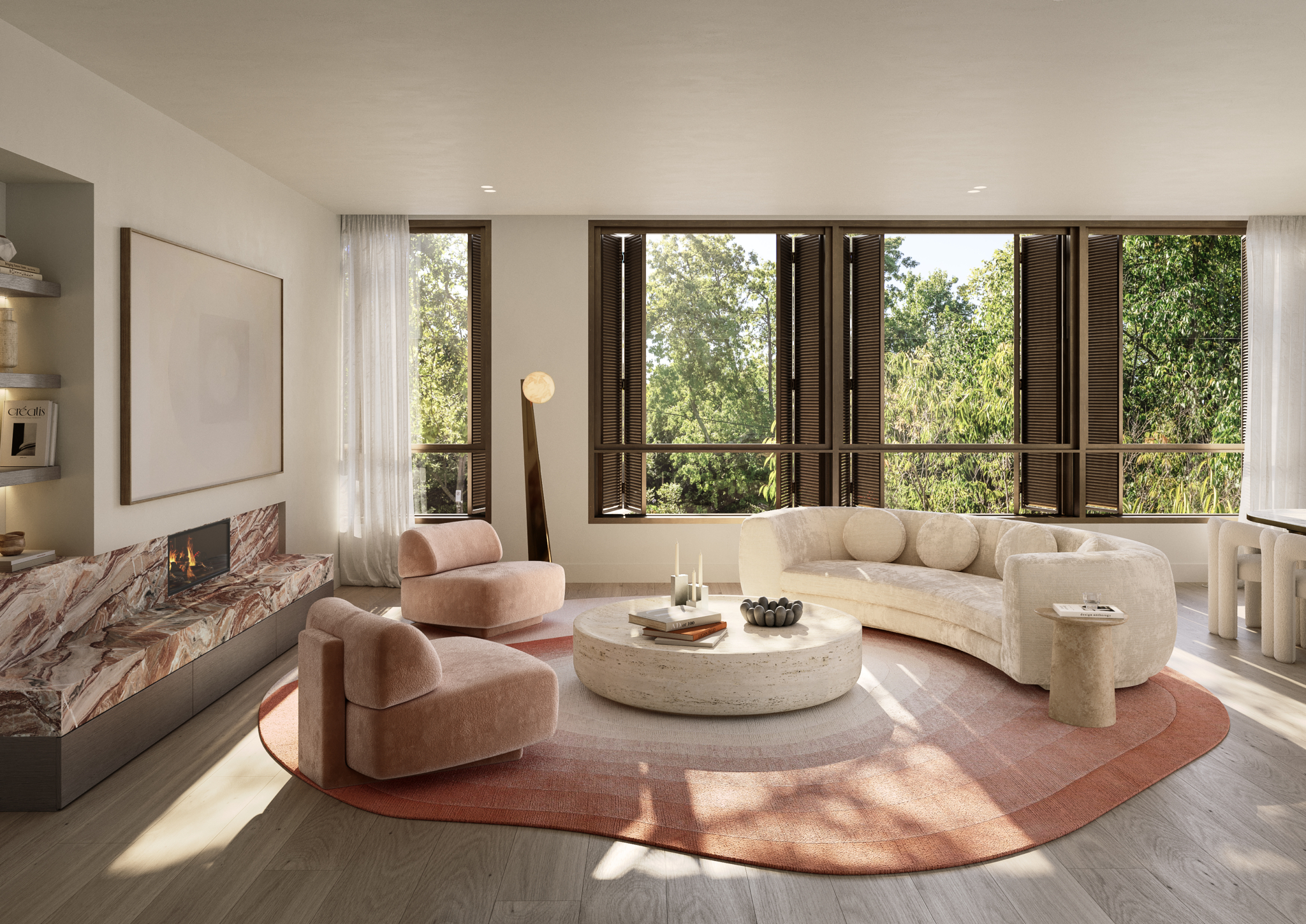 Opulent Living: Grand in proportion, the home’s main living and dining zone features an abundance of space and is flooded with natural light through full-height windows and doors.